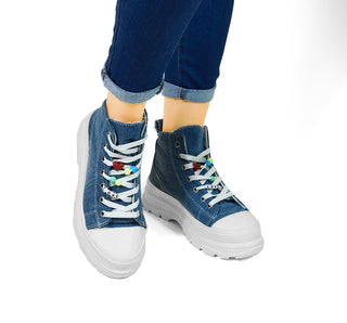 0R778 GOSH Línea de calzado tipo tenis de acabado textil. Diseño moderno y juvenil de suela ancha estilo chunky, y ajuste mediante agujetas decoradas con cuentas de pedrería de colores.