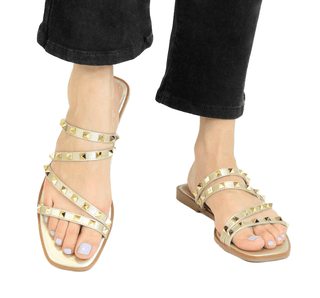 2003468 Salamandra Línea de calzado tipo sandalia de piso con acabado sintético. Diseño juvenil y fresco con estoperoles decorativos en cintas, y de tacón bajo que brinda mayor estabilidad.