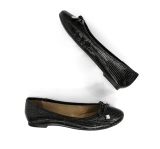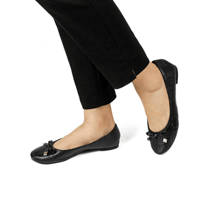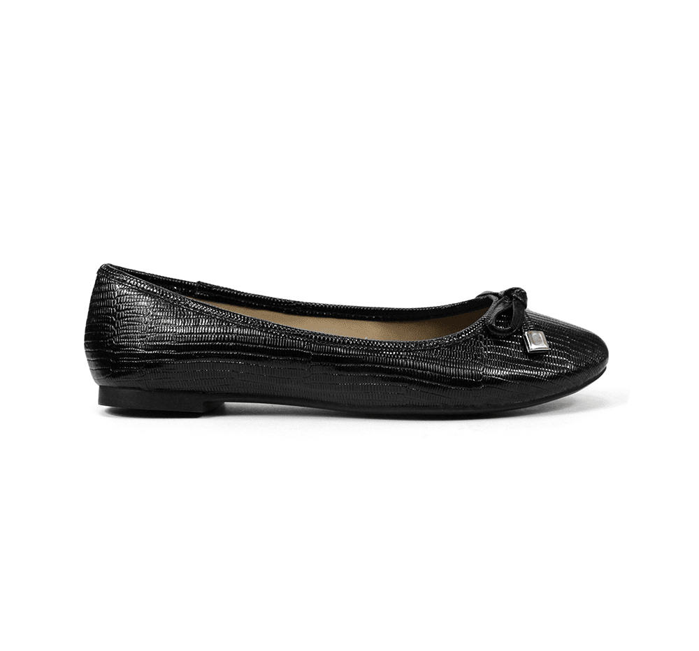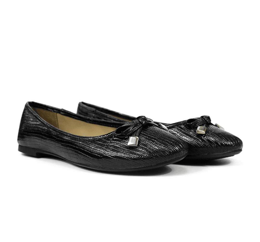 209E55 Salamandra Línea de calzado tipo flat de acabado sintético estilo charol. Diseño ligero con textura en superficie y moño decorativo en punta.