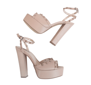 221806 Efe Línea de calzado tipo zapatilla de acabado sintético. Diseño fresco y cómodo, con estoperoles decorativos en cintas, de plataforma media, tacón alto y ajuste mediante hebilla en pulsera del tobillo.