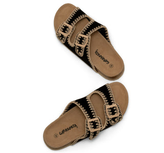 311003 Garrapata Línea de calzado tipo sandalia acabado textil. Diseño moderno con plantilla anatómica y suela de 2 cm que aporta comodidad al caminar.