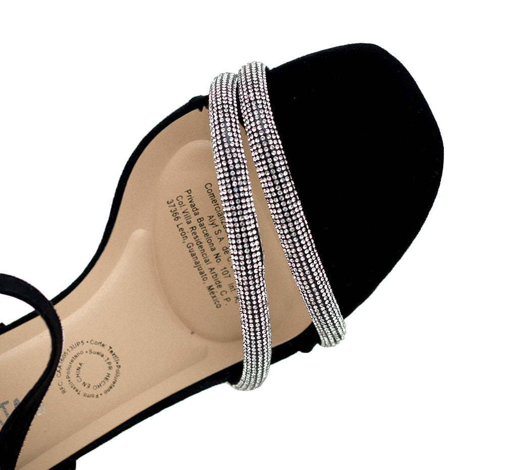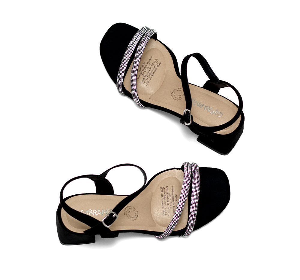 614001 Garrapata Línea de calzado tipo sandalia de acabado metalizado. Diseño moderno e innovador con glitter decorativo en tacón medio, le da un toque de elegancia.