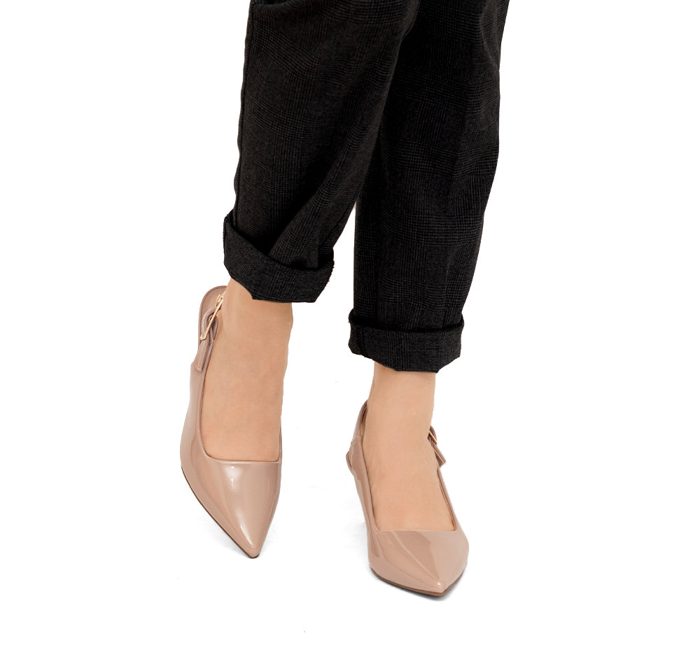 763001 GARRAPATA Línea de calzado tipo zapatilla de acabado charol. Diseño moderno e innovador con tacón medio y ajuste mediante hebilla en pulsera de tobillo