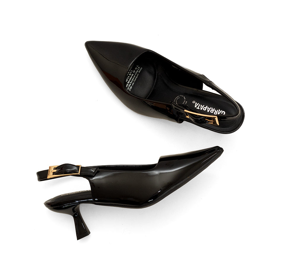 763001 GARRAPATA Línea de calzado tipo zapatilla de acabado charol. Diseño moderno e innovador con tacón medio y ajuste mediante hebilla en pulsera de tobillo