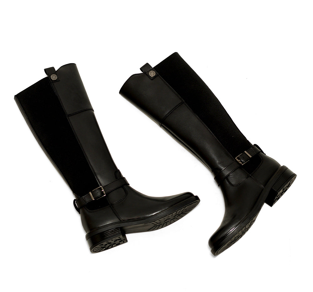 995002 Gillio Línea de calzado tipo bota larga con acabado sintético. Diseño moderno, vanguardista y cómodo con tacón bajo, hebillas decorativas y ajuste mediante cierre en parte lateral interno ideal para esta temporada.