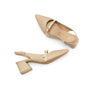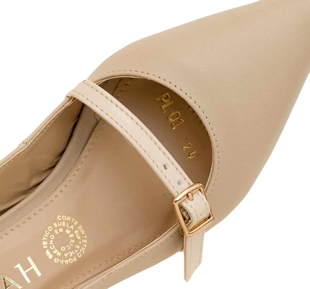 PL-01 Sarah Studio Línea de calzado tipo zapatilla de acabado sintético. Diseño moderno e innovador con tacón bajo y ajuste mediante hebilla en pulsera de tobillo.